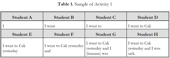 In this activity, I asked students to sit in a semicircle. Each student had to say a word, one by one, following the structure of the previous word already mentioned. For example, Student A would say “I,” or “you,” or “he.” Then, Student B would continue with another word following the structure of the word Student A mentioned. For example, Student B would say “I went,” because students would already know that a personal pronoun is usually followed by a verb. Student C would follow through with the third word: “I went to,” and so on. Consequently, students would remember grammar and structures in the language and they would be listening to their peers (See Table 1).