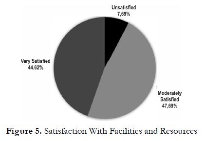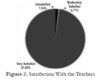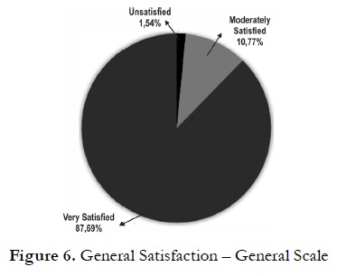 The first step to conduct the analysis was to transform the answers into a continuous variable. The different answer options had a higher or lower value according to the degree of agreement regarding the 32 statements: 5 (totally agree), 4 (agree), 3 (neither agree, nor disagree), 2 (disagree), 1 (totally disagree). This led to establish a theoretical mean and cut-off points for the categories. This was the basis for re-coding the average of each participant’s answers for a particular category in one of these satisfaction levels: (1) unsatisfied, (2) moderately satisfied, (3) very satisfied. The answers provided by the surveyed students show that there is an overall positive assessment in the way foreign language courses are currently administered and are summarized Figures 1 to 6.