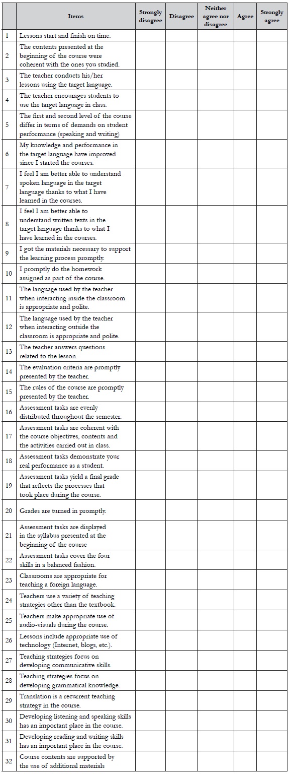 The instrument had 32 Likert-type questions related to satisfaction in six dimensions: the course, student performance, teacher-student interaction, assessment practices, facilities and resources, methodology; and one open-ended question aimed at collecting suggestions about the courses (see Appendix). The items were designed by three foreign language teachers and a psychologist, which ensures a valid measure of how satisfied learners are with L2 courses. The reliability level was high (α = 0.92). The questions were written in Spanish in order to avoid ambiguity or misunderstandings.