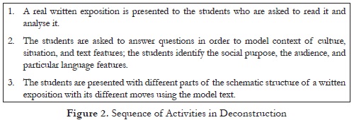Figure 2 shows the sequence of activities in the first part of a genre-based lesson: the deconstruction. Based on that information, I can conclude that the role of the teacher in the deconstruction stage is necessary because he has to encourage the students to analyze the text by means of eliciting them to participate in the discussion. This first phase is essential since students develop knowledge and skills about the particularities of the text being deconstructed and therefore learners form a basis for the next step, where they start the construction of the genre. According to Rose and Martin (2012), teachers’ feedback is very important while students are in contact with real models of the genre. The teacher has to give specific explanation about the genre under construction, the stages and moves within the text.