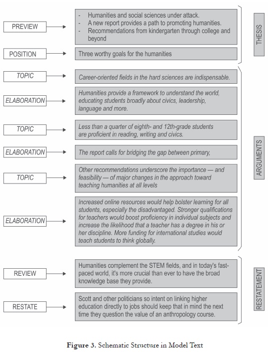 Figure 1 shows the schematic structure of the genre of exposition. This genre is organized into three main stages that represent the flow of information in the development of arguments. These stages are subdivided into different moves or sub-steps to make the text coherent; that is, information is clear and easy to be followed by the intended audience and it focuses on a particular topic. Students need to consider these stages because they form the basis for developing this genre coherently.