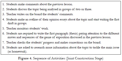 In the sequence of activities shown in Figure 4, the teacher’s role is relevant because he has to negotiate different parts of the genre being constructed with his students by means of questions and group discussion. Therefore, these interactions (students-teacher) give students opportunities to feel more confident about the writing process.