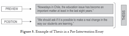 Figure 5 illustrates the common pathway of introduction development for an expository essay proposed by Rose and Martin (2012); according to them, the introduction of this type of essay has to do with a Thesis divided into a preview and the position. This example shows an effective development of a Thesis in the pre-intervention essay.