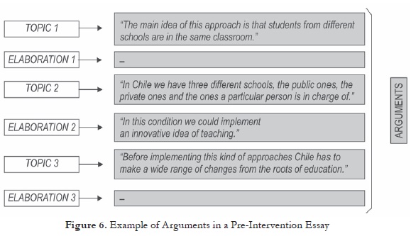 Regarding the Arguments per se, four of the exposition essays had two paragraphs devoted to the body of the essay, while the other six essays had three paragraphs; different topics were presented with their elaborations in each paragraph. However, most elaborations were not clearly supported, or relevant information was omitted as shown in Figure 6.