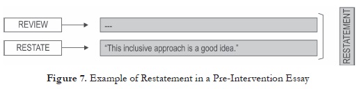 Figure 7 shows that the last paragraph is not accurately developed as it lacks the review of the information presented in the text. The restate is a vague opinion which is not supported with evidence. In the general analysis, the Restatement was the less worked by the students because the content and supporting information were omitted.