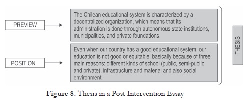 Figure 8 illustrates that the Thesis of the example essay is complete. The two parts of the first paragraph in an expository essay are present, well-developed, and supported; the preview presents background information related to the topic at issue and the position shows the author’s opinion regarding the topic at issue.