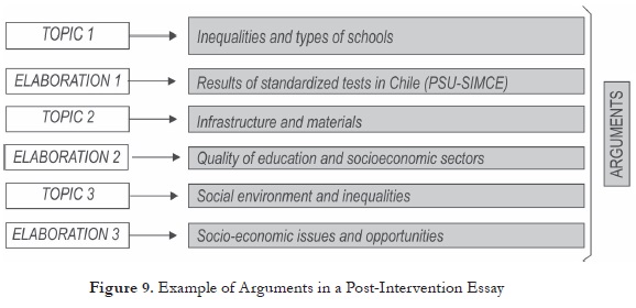 In relation to the body of the essays, all the paragraphs had a clear topic with their respective elaboration; the elaboration of ideas was clear and supportive, different from the pre-intervention essays where topics were not evidently elaborated, information was omitted, or extra information was needed to support the topics at issue. Figure 9 illustrates how information flows in a post-intervention essay at the level of the arguments.