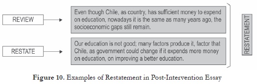 Finally, the concluding paragraphs summarized the standpoint at issue through the Review and the Restate of the main contents and topics developed in the essays. Post-intervention expository essays had a better quality in the conclusions because all the ten texts included the Review and the Restate of the information. Figure 10 represents how information was summarized in the Restatement paragraph of a post-intervention essay.