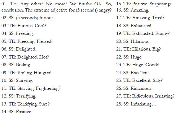 As Excerpt 1 demonstrates, the interactional forms that teacher educators display during classroom interaction, such as socio-linguistic styles, represent their interactional styles. Next, in Excerpt 2, a long pattern exercised by another teacher educator and her students during a language-based class also gives evidence of the way teacher educators establish their interactional styles in ELTE classroom interaction. In this example, the students were practicing a list of adjectives in English.