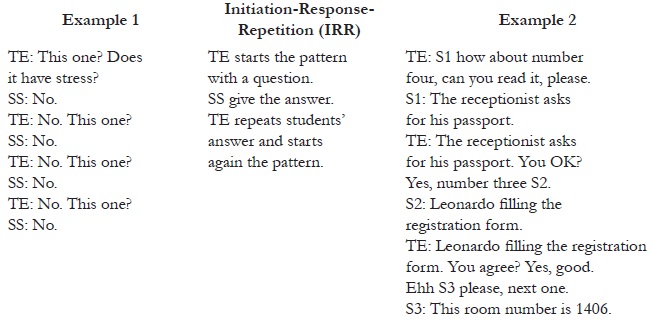 In both examples, the teacher educator started the interaction by asking students a question; after this, the students gave the answer to that question and finally, the teacher educator repeats that given answer and starts the pattern again. As shown in Excerpt 3, this interactional style took place the same in both cases. This gives evidence of homogeneity in the interactional style of both teacher educators yet in different classes. The class of Example 1 was at the languages laboratory working on English intonation and stress (a content-based class); due to its arrangement, in sections of four computers per table, the teacher educator mostly had a more individual interaction, face to face with the students. In the second case, a language-based class, the teacher educator was standing and nominating students to answer exercises from the book in the classroom.