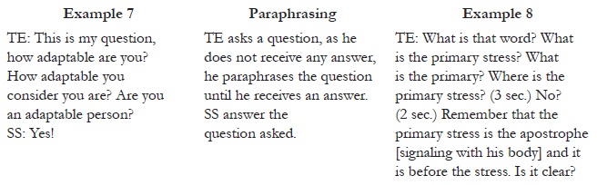 Although the students responded in Example 7, the answer did not seem to be coherent with the original question. They only responded with the monosyllable “yes”. This might be the result of the paraphrasing of the original question to a yes/no question. On the other hand, in Example 8, the teacher educator maintained the paraphrasing under the wh-question structure, but he did not receive an answer. He then had to give an answer-explanation to keep the class activity going.