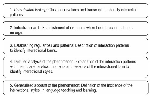 After recording, we transcribed the classroom interaction and created a matrix of analysis with the instances in which regular interaction patterns and forms occurred. With this compendium of instances, we were able to explain the prominent characteristics and moments of emergence of each form and pattern with a vision of interactional styles. We followed the steps in Figure 1 to identify them.