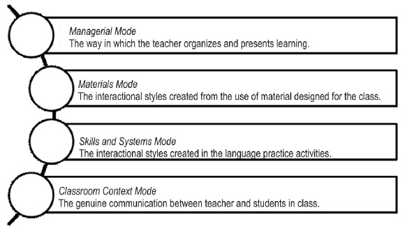 After analyzing the classroom interaction in each of the 34recorded sessions and each matrix containing the identified interaction patterns, we studied the exchanges before and after each pattern to explain the situational moment and reasons of emergence of the interactional forms, which helped us to determine the interactional styles. We interviewed each of the nine teacher educators to understand, on the one hand, the way they organized either language or content teaching and learning; and on the other hand, the interaction around the materials used and the lesson activities. We then created a second matrix of analysis containing the insights gathered in each interview. Following the SETT methodology (Walsh, 2011), we organized these insights into four modes as shown in Figure 2.