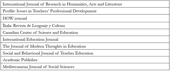 Based on the research question, the first exploratory stage was developed through the exploration of the literature of several sources from which 23 research reports were chosen. The selected studies were academic outcomes related to the reflective teaching strategies incorporation in schools and universities in public or private institutions. To do so, I conducted an online search using Google search and Science Direct. I found around 60 articles, institutional reports, and published journals not only in databases in Colombia but also in databases from Canadian, European, Indian, and Australian universities. Only 23 were selected based on the research question and objectives, and because of their importance in the English language and teaching community. More specifically, the articles needed to address research on reflective teaching, reflective teaching strategies, professional practices, and professional development. Table 1 shows the most relevant journals considered for the exploration.