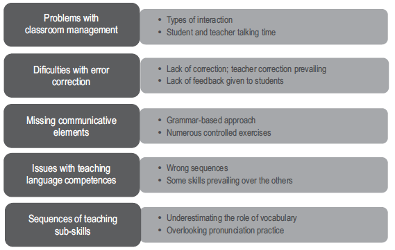 Lack of application of the new knowledge by teachers. On many occasions, teachers showed a lack of ability to turn the theory into practice. For instance, they were not always able to implement strategies that dealt with error correction, teacher and student talking time, teaching writing and listening. Furthermore, the class observations (both by the researchers and the external observer) revealed the fact that the teachers did not apply the concepts, strategies, and techniques that were presented in the course of the program to the full extent. Therefore, despite teachers’ positive perception of their own performance, they still lacked the ability to connect theory and practice which would allow them to implement the knowledge they acquired in the program to their daily practice. A good example here might be the topic of error correction: During the class observations, we noticed that teacher correction still prevailed and that very few error correction techniques were actually implemented.