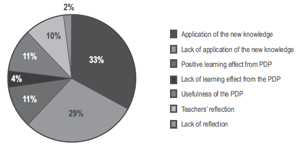No new theory in the PDP. A few teachers (6%) admitted that they did not learn new things during the development of the program, stating that they had vast experience in the field. However, the majority of the participants had an open-minded approach towards their own teaching that let them accept new ideas. This finding may speak in favor of many experts’ opinions that professional development should be personalized. Various reasons may cause that; however, the one that is mentioned more frequently is the fact that at different stages of their careers teachers may have different learning needs (Eros, 2011).