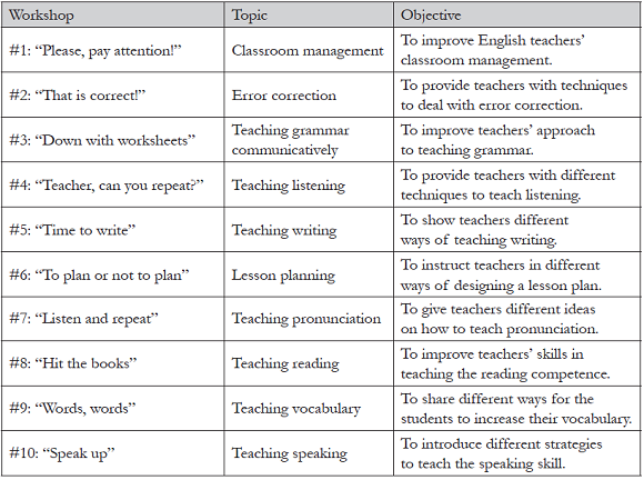 During the action and evaluation stage, several other instruments were applied. Class observation checklists (internal and external observer) were aimed at identifying how well teachers could apply the new knowledge that they received during the workshops in their classrooms. Lesson plan analysis was used in order to find out if the teachers were putting into practice the knowledge they obtained during the workshop. A teacher questionnaire, which was administered after each class observation, intended to learn about the participants’ opinion about their own performance, as well as the effectiveness of the workshops. Finally, we applied a survey to find out what the teachers felt towards the program, and suggestions that could help improve it.