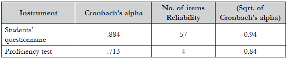 According to Dörnyei (2003), data collection tools should score not less than 0.60 to be considered reliable. Table 1 shows the instruments reliability.