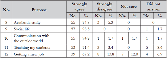 Section B in the questionnaire sought to answer this research question. It asked the participants about the purposes for which they need English. It attempted to identify the purposes behind the TAs’ need for the English language. The results are shown in Table 2.