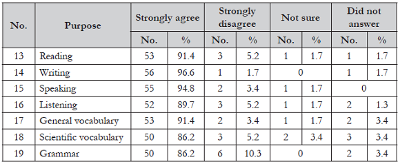 The questionnaire contained open-ended questions asking the participants to list some sub-skills not listed in the questionnaire. These were Items 36 for writing sub-skills, 49 for reading, 57 for speaking, and 68 for listening. Ten (17.2%) of the participants responded to these items. For Item 36, the TAs suggested writing stories, recommendation letters, formal emails, scientific papers, and publishing papers.