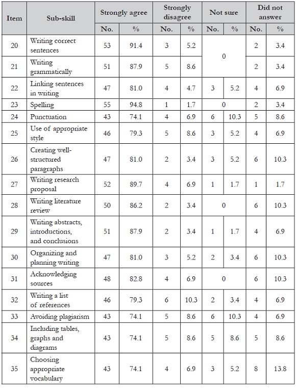 Items 20 to 67 in the questionnaire covered the sub-skills of the main four skills. Writing sub-skills are included in Items 20 to 35, and Table 4 presents the results.