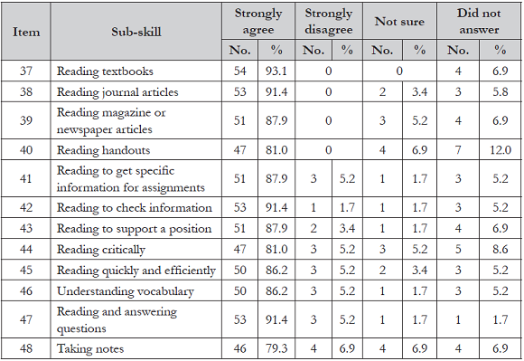 Table 5 shows that reading textbooks is the most important reading sub-skill as all the participants who gave an answer to this item (54, 93.1%) strongly agreed on it. It is followed by reading journal articles, reading to check information (53, 91.4 %), reading magazine or newspaper articles, reading to support position (51, 87.9%); reading and answering questions (53, 91.4%), understanding vocabulary; and reading quickly and efficiently (50, 86.2%). Most of these sub-skills are related to academic writing. The results suggest that an academic reading course that teaches all these sub-skills is strongly recommended to prepare the TAs for their academic studies in the future. The results of this study, concerning reading sub-skills, are unique because the previous studies did not cater to them.