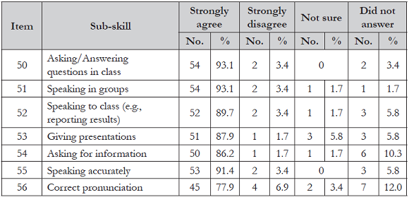 As for speaking sub-skills, they were included in items 50 to 56 in the questionnaire. The results show that the most important speaking sub-skills were, asking and answering questions, speaking in groups since 54 (93.1%) of the subjects who responded to this item strongly agreed on both sub-skills. These are followed by speaking accurately (53, 91.4%), speaking to class (reporting results) (52, 89.7%), giving presentations (51, 87.9%), and asking for information (50, 86.2%), (see Table 6).