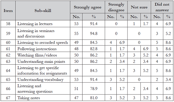 The last set of academic sub-skills belongs to listening and it is covered by Items 58 to 67 in the questionnaire. The results are displayed in Table 7.