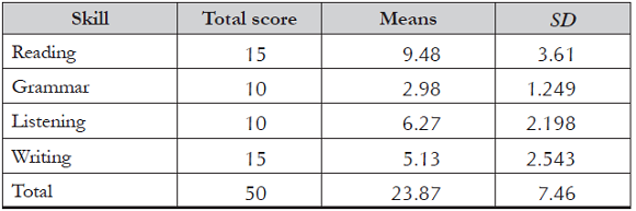 As seen in Table 8, the TAs’ proficiency is below average as the total means is 23.87. They were weak in grammar (M = 2.98), average in listening (M = 6.27) and writing (M = 5.13). However, reading was the best skill (M = 9.48). This can be attributed to the fact that the reading questions were direct, and they did not require high level thinking. Also, the TAs had a lot of training in reading during their previous study of English language. Surprisingly, grammar is the weakest language area although they studied it extensively in secondary school and university courses. This might have been caused by the fact that the TAs were not in contact with grammar for a long time. Concerning listening, the TAs are average. This skill was not focused on in any previous English courses they had studied. As for writing, the TAs suffered from many problems such as sentence structure, subject verb agreement, use of correct vocabulary, style, and punctuation. It could be stated that the TAs’ level of proficiency is below average. This may be due to the weak English syllabus in the secondary school and university. Another reason is that the time allotted for English courses is not enough to improve students’ level of proficiency. Use of Arabic as the language of instruction in the university can be an additional reason for this level. These results match with what was revealed by Bedoya et al. (2015) and Bouabdallah (2015), who concluded that their participants were not proficient in English. Similar to the results of this study, Moattarian and Tahririan (2014) found that the previous courses taken by their participants were not useful.