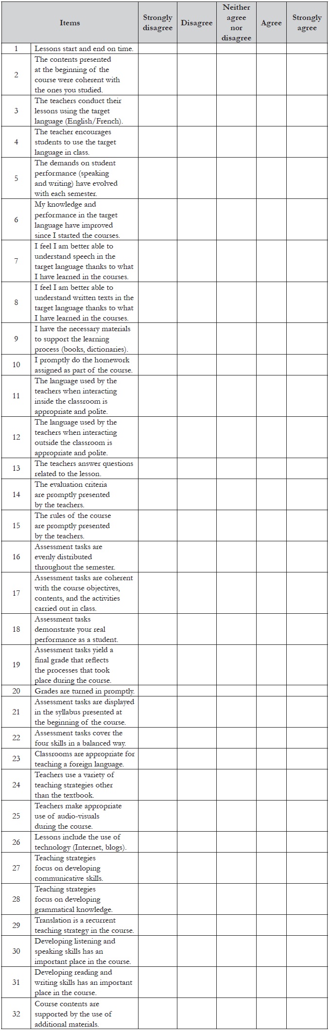 The participants completed an anonymous survey containing 32 items with a five-point Likert scale and one open-ended question. The instrument used (Sánchez Solarte, Obando Guerrero, & Ibarra Santacruz, 2017) was previously administered and proved to be effective in terms of the quantity and quality of the information elicited. The 32 statements covered wide areas that were likely to affect learners’ satisfaction. The questions addressed these areas: course organization (Items 1, 2, 5, 15, 16, 20, 21), students’ performance (Items 6, 7, 8, 10), teacher and students’ interaction (Items 3, 4, 11, 12, 13), assessment practices (Items 14, 17, 18, 19, 21), facilities and resources used (Items 9, 23, 25, 26, 32), and methodology used in the courses (Items 24, 27, 28, 29, 30, 31) (see Appendix). The answers to the closed-ended items were run through a statistics analysis program, the SPSS 24, for frequency and percentages. The responses to the open-ended question were processed with NVivo to facilitate the grouping of data into categories such as class size or classroom management. These categories provided detailed information about factors affecting learners’ satisfaction and pointed at specific ideas to enhance the effectiveness of the programs that could be analyzed in future curriculum evaluation processes.